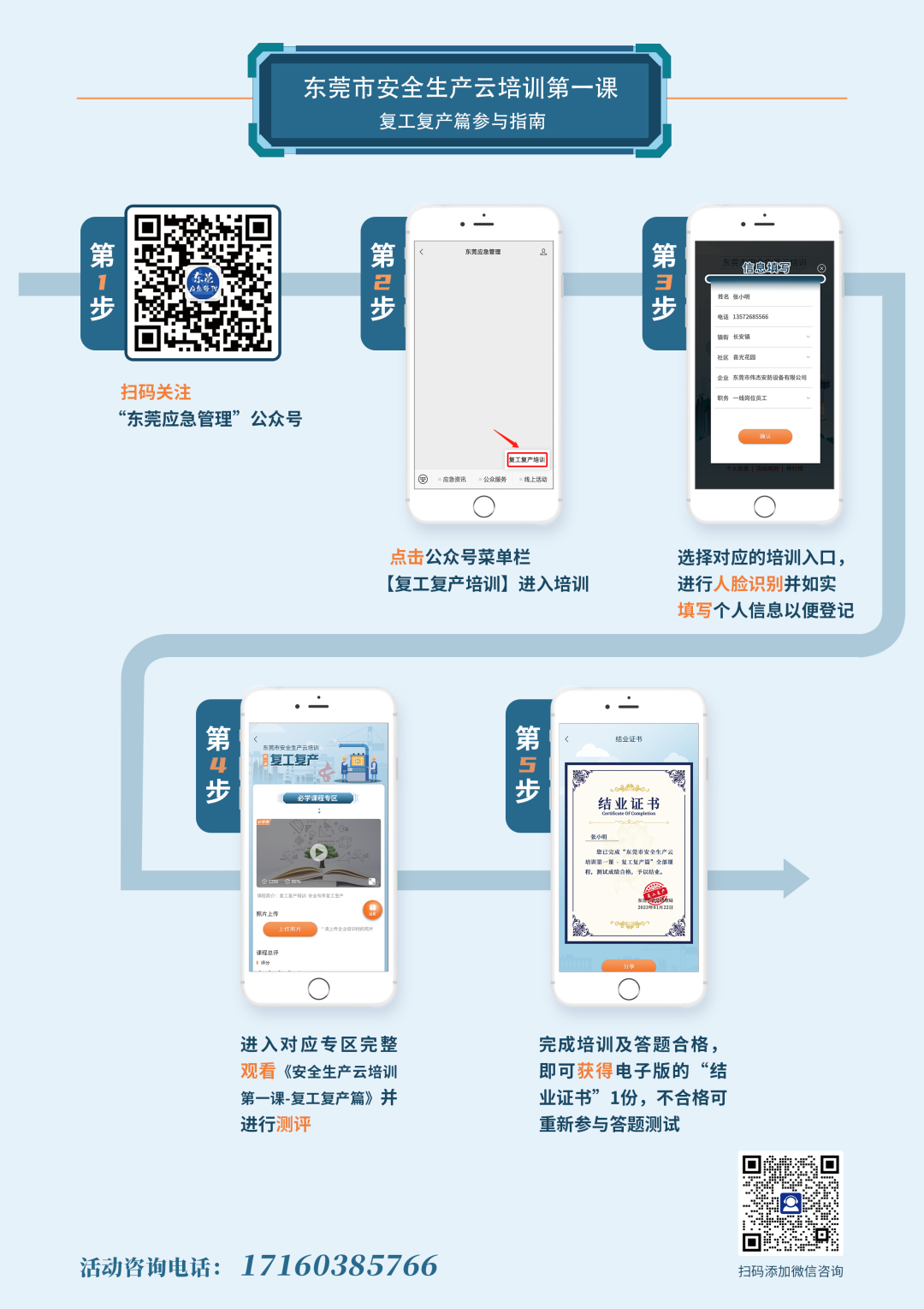 參與指南:關(guān)注“東莞應(yīng)急管理”公眾號(hào),通過點(diǎn)擊公眾號(hào)菜單欄【線上活動(dòng)→復(fù)工復(fù)產(chǎn)培訓(xùn)】,登記個(gè)人信息,完成注冊(cè)后,點(diǎn)擊“我要參加”進(jìn)入培訓(xùn)內(nèi)容界面,點(diǎn)擊觀看視頻進(jìn)行學(xué)習(xí)。