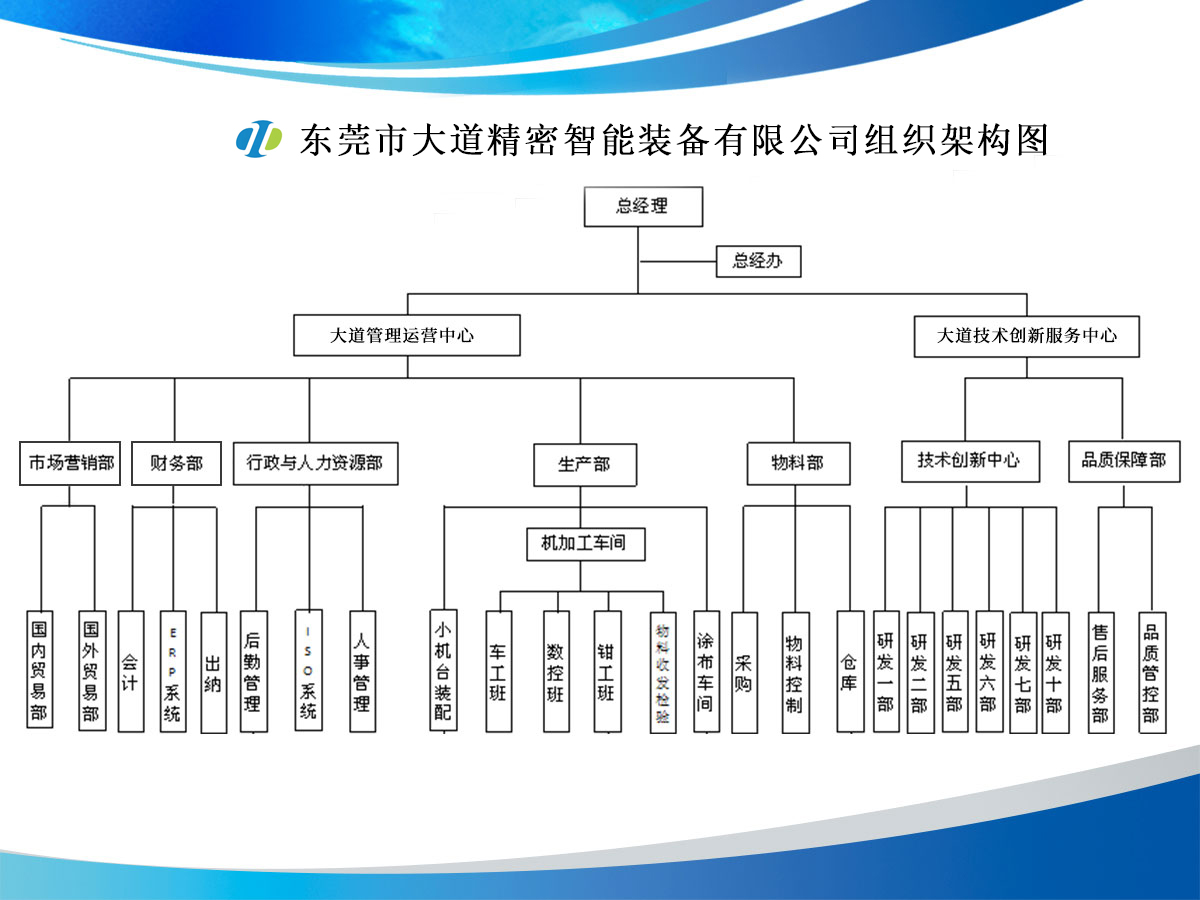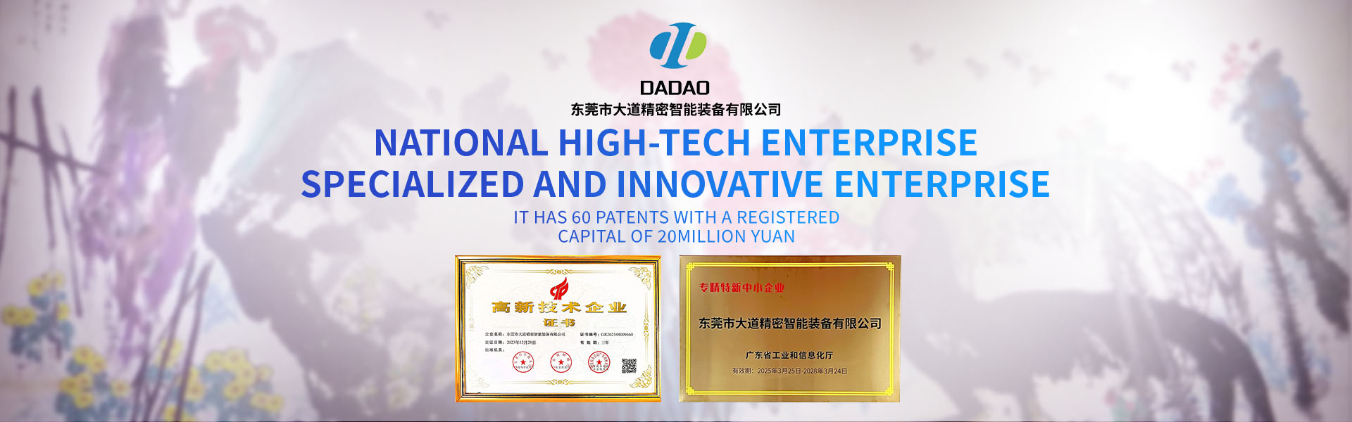 Da Dao Precision was established in 2019, with a registered capital of 10 million yuan and over 18000 square meters of offices, factories, and other facilities. It has passed the ISO9001:2015 international quality management system certification, has a total of 58 national patents of various kinds, and has won honorary titles such as "China Avenue, Trademark" and "The 10th Anniversary of the the Belt and Road, National Ritual Brand". It is a national high-tech enterprise. The "Dongguan Dadao Precision Intelligent Equipment Co., Ltd. Care for the Next Generation Work Committee" was established in April 2023. It is a vice chairman unit of the Qishi Town Federation of Industry and Commerce, vice chairman unit of the Qishi Town Federation of Literary and Art Circles, vice chairman unit of the Dongguan Environmental Protection Packaging Industry Association, second president unit of the Dongguan CNC Equipment Industry Association, and executive director unit of the Guangdong Packaging Technology Association, 2024 Council unit of Guangdong Adhesive Industry Association.